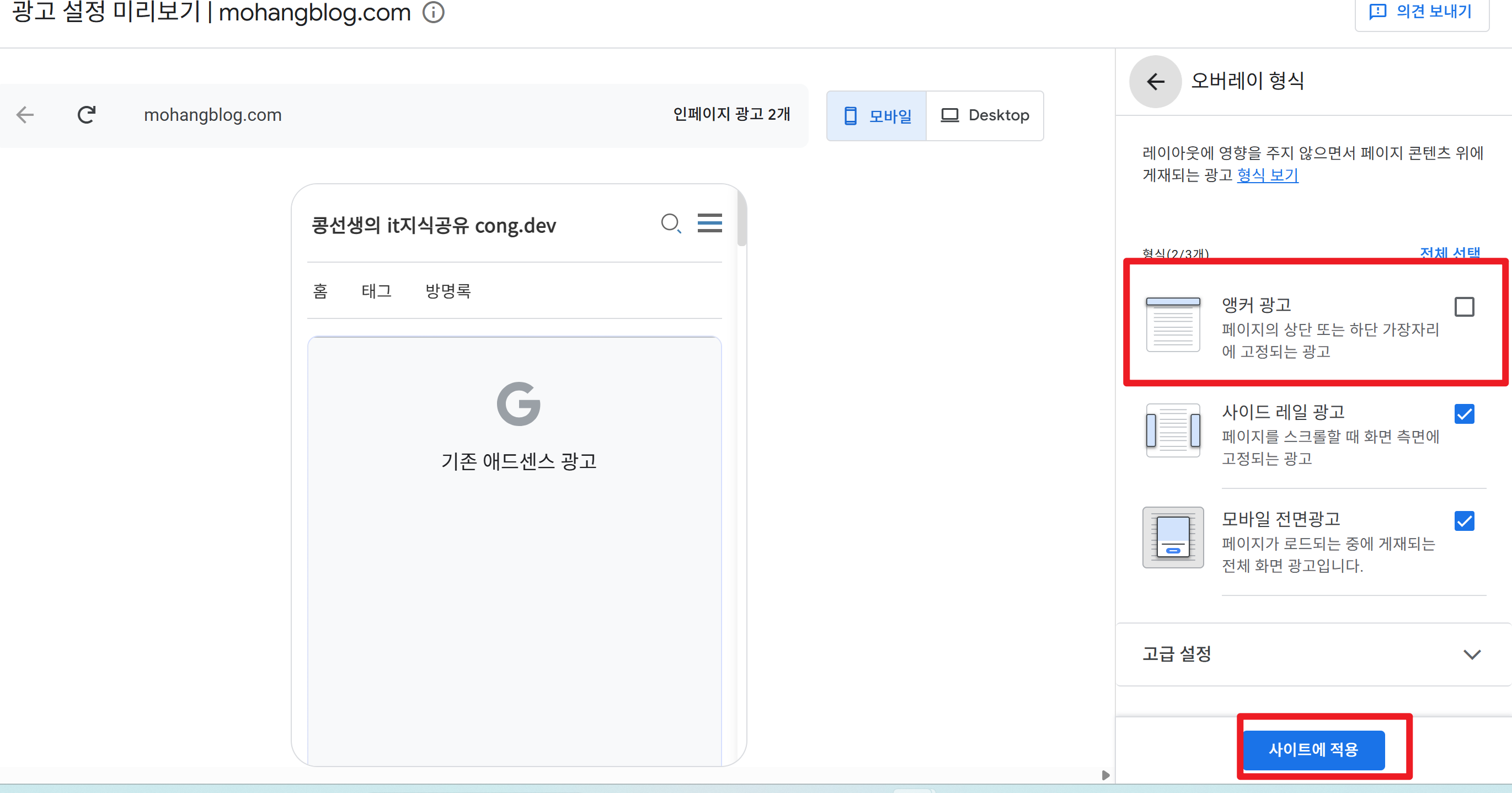 애드센스 사이트접속 - 광고(사이트 기준) - 오버레이형식 - 앵커광고 off