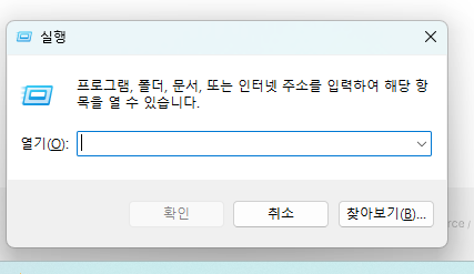- 윈도우 단축키로 실행창 켜기 : Win(윈도우키) + R 키를 같이 눌러주면 실행창이 뜹니다.