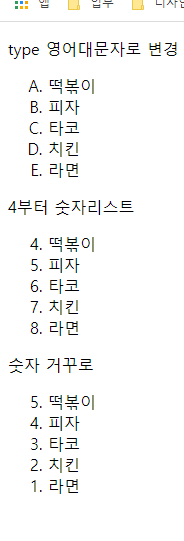 - <ol>리스트에는 type,start,reserved와 같은 속성을 사용할 수 있습니다.