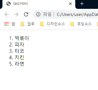 - <ul>과 동일하게 내부에 <li>로 리스트를 작성합니다.