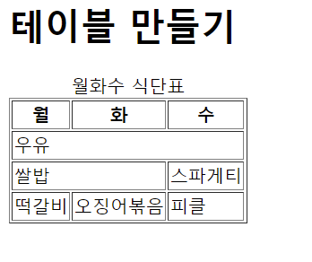 - 모든 테이블 행에는 셀의 수가 동일해야합니다. (셀을 합쳐야할경우, 아래 배우게 될 colspan,rowspan속성을 이용합니다.)