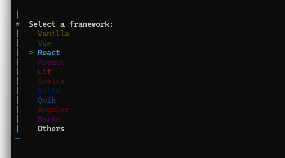 원하는 프레임워크 선택하면됩니다. react 프로젝트를 생성할거라 React를 선택했습니다.